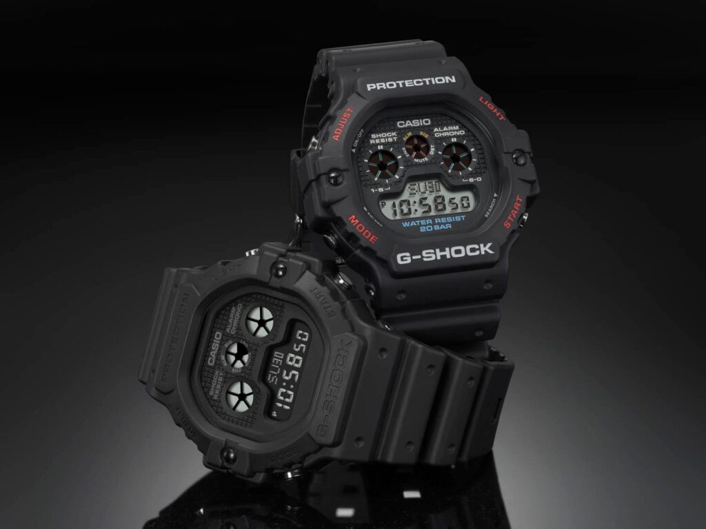 Both versions retain the signature DW-5900 layout, with three digital graph indicators at the top of the dial and a larger main display below. Core features remain unchanged, including world time, a countdown timer, a 1/100-second stopwatch, and support for up to five daily alarms.